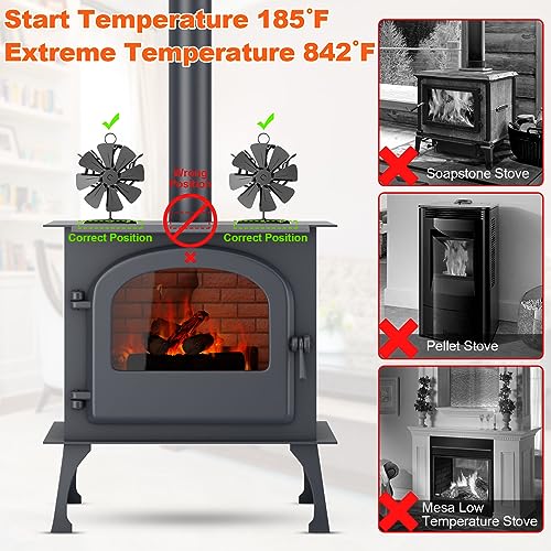 【Trazione Termica, Risparmio Energetico】 La ventola del camino aggiornata ha un chip integrato per la differenza di temperatura, che non richiede elettricità. Quando la temperatura superficiale del caminetto raggiunge i 185 ℉, inizia a funzionare. Quando la temperatura raggiunge 842 ℉ (temperatura limite), è necessario rimuovere in tempo la ventola della stufa ed evitare che il motore venga danneggiato a causa dell'alta temperatura.