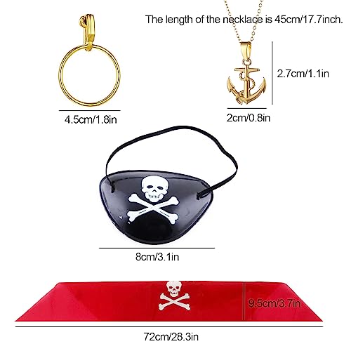 Set di costumi da pirata di valore: Gli accessori del costume da pirata includono 2 pezzi di cravatta da testa di pirata, 1 pezzo di benda da occhio da pirata, 1 pezzo di orecchino a cerchio dorato e 2 pezzi di collana a catena con ciondolo, 6 pezzi in totale, che consentono di indossarli insieme o separati per creare look diversi.
