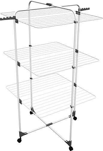 Vileda Level 3 Stendibiancheria a Torre, Stendino con Supporto Grucce, Tre Ripiani, Ripiegabile, con Ruote, in Acciaio, Bianco, 2 x 73.5 x 125.5 cm