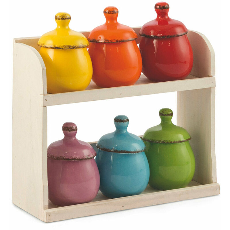 Barattoli Set 6 Brattolini con Stand in Ceramica e Legno Villa d'Este Baita La linea Baita mette a disposizione della tavola e della cucina una vasta gamma di piatti, ciotole e insalatiere e complementi che rispettano le linee guida tradizionali pur aprendosi a forme innovative. L'inconfondibile pennellata e i colori energici sposano profili nuovi: la tavola si completa mantenendo intatta la sua genuinità. Caratteristiche Tecniche Baita Set 6 Barattolini In ceramica Con coperchio Stand in legno bianco Bordino marrone Stand: l. 24,5 x p. 9 x h. 25 cm Barattolini: Ø 7,5 x h. 11 cm Lavabili in lavastoviglie Colori: rosso, arancio, giallo, verde, celeste e viola.
