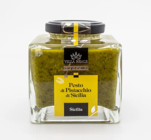 VILLA REALE SUPREME | PESTO DI PISTACCHIO DI SICILIA 180 GR. Sugo pronto siciliano prodotto con Pistacchi Siciliani tritati con un pizzico di sale e olio. 100% Made in Italy