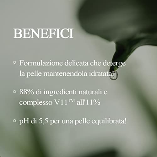 FORMULA: formulazione delicata con ingredienti di origine vegetale contenenti acido lattico, acido glicolico e acido salicilico allo 0,5%. 88% di ingredienti naturali con complesso V11 all'11% e pH 5,5 per una pelle equilibrata!