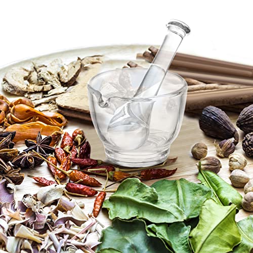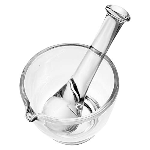Il prodotto è un mortaio e pestello di vetro professionale che consente di schiacciare facilmente e rapidamente erbe fresche e spezie.