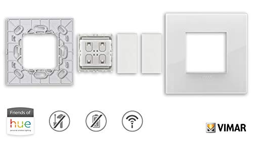 Vimar 0k03906.05 kit interruttore senza fili in radiofrequenza philips friends o hue serie arké classic. Non servono batterie. Kit comando friends o hue contiene: 1 comando 03906, 1 supporto 19507.cl.b bianco, 2 tasti 19506.b bianco, 1 placca 2 moduli 19642.b66 reflex ghiaccio total look.