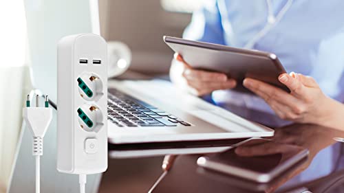 Vimar 0R00625.CC.B Presa multipla con interruttore e cavo da 1,5 m, 2 uscite SICURY universale e spina standard italiano, 2 uscite USB A, bianco