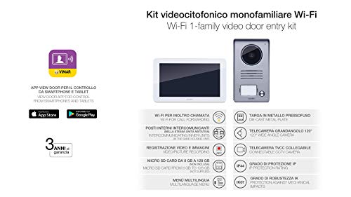 Vimar k40945 kit videocitofonico da parete contenente 1 videocitofono touch screen vivavoce Wi-Fi a colori LCD 7 in, 1 targa audiovideo 1 pulsante con cornice parapioggia, 1 alimentatore 24 vdc 1 a con spine intercambiabili standard europeo, british, americano ed australiano, completo di staffe per il fissaggio a parete.