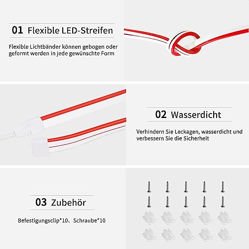 Flessibile e impermeabile: rispetto alle normali strisce LED, questa striscia LED neon è più flessibile, può essere piegata a piacimento a 360°, puoi piegarla facilmente nella forma desiderata. Può decorare facilmente la camera da letto, la cucina. IP65 impermeabile, adatto per interni ed esterni.