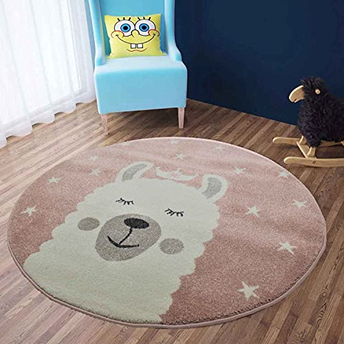 VIMODA Tappeto per bambini lama re stelle per cameretta dei bambini, colore rosa, crema, pelo corto, morbido, soffice, dimensioni: Ø 120 cm, rotondo