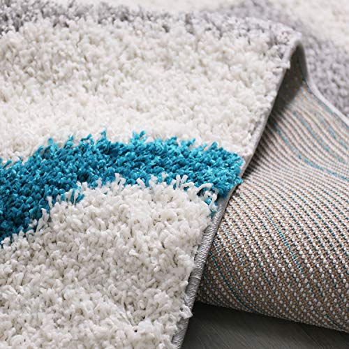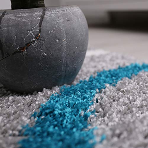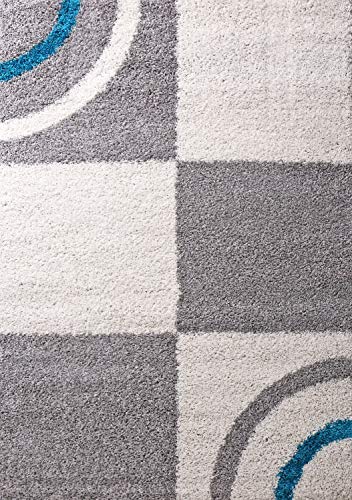 VIMODA Tappeto per soggiorno, a pelo lungo, stile Shaggy, decorazioni a quadri e strisce, colori: turchese, crema e grigio, facile da pulire, moderno dimensioni: 160 x 220 cm