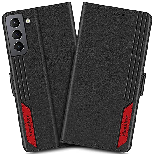 Vinanker Cover per Galaxy S21 5G, Flip Cover in Pelle Premium Portafoglio con Blocco RFID Custodia per Samsung Galaxy S21 5G (Nero/Rosso)