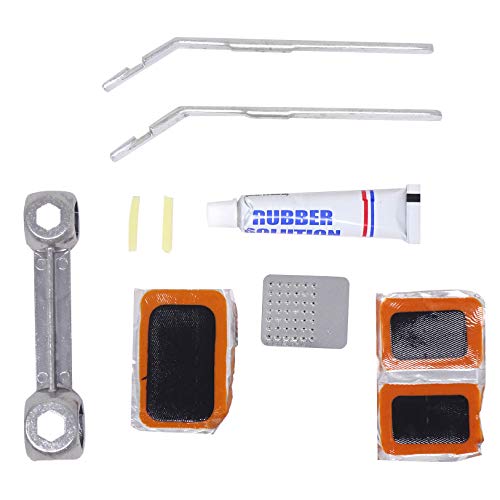 Il kit consta dei seguenti pezzi: 1x chiave esagonale multi dimensione per viti dai 6 ai 15 1x grattugia in metallo per la pulizia della camera d'aria 3x pezze toppe per riparare le bucature, due piccole (2.5 x 1.5 cm) e una grande (4 x 2.5 cm) 2x levagomma in metallo per lo sgancio dello pneumatico dal cerchione 1x tubetto di mastice 2x tubicini in gomma