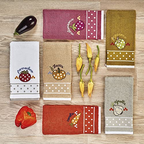 Asciugamani da cucina in diversi colori con disegno ricamato sul bordo e bordi cuciti per una maggiore durata.
