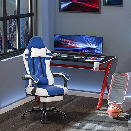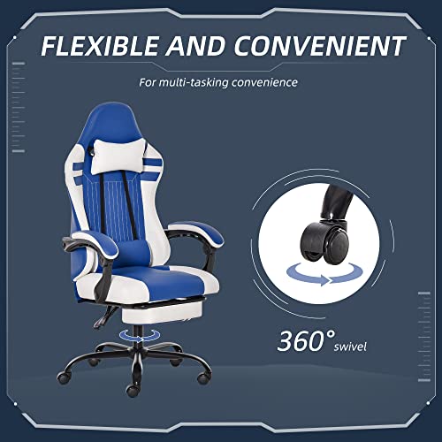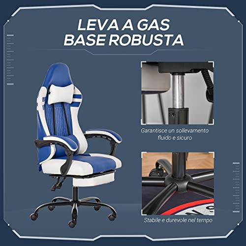 Vinsetto Poltrona Gaming da Ufficio in Similpelle Blu e Bianca Regolabile e Reclinabile 160° con Cuscini e Poggiapiedi