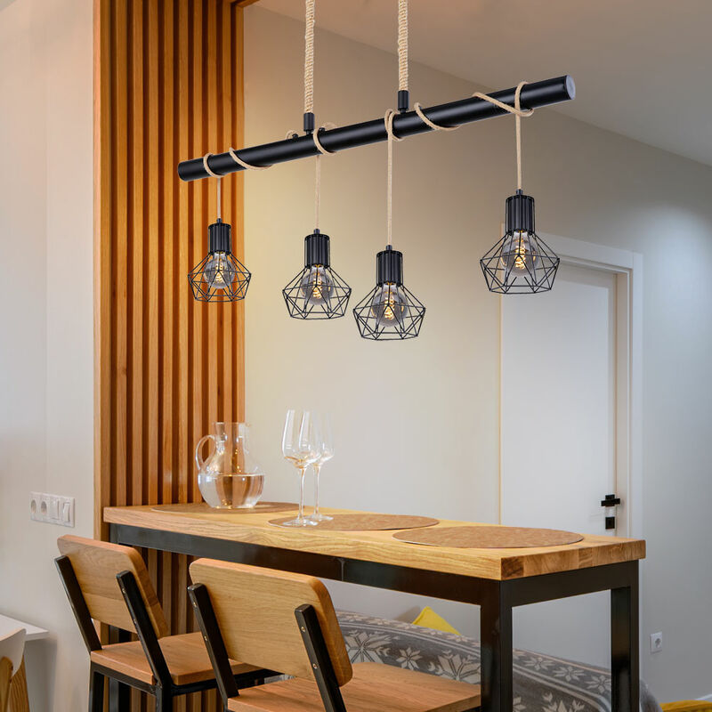 Descrizione La lampada a sospensione convince con il suo design elegante/moderno. Gli schermi reticolari in metallo nero a forma di diamante attirano l'attenzione. La lampada a sospensione è dotata di attacchi E27, che ti consentono di scegliere tu stesso la fonte di luce giusta per te (max. 60W) e determinare così il colore della luce e l'intensità della luce. A causa del loro risparmio energetico e durata, consigliamo le lampade a LED. Puoi completare il quadro nelle tue quattro pareti con altre luci di questa serie. Le lampadine non sono incluse nella fornitura. Dettagli lampada • Tipo di lampada: lampada a sospensione • Materiale: metallo, corda di canapa • Colore: marrone, nero • Paralumi: metallo nero, design reticolare • Lunghezza x larghezza x altezza in cm: 100x15x120 • Prese: 4x E27 • Lampadine incluse: no • Lampadine: massimo 4x 60 watt • Alimentazione: 220 -240V, 50 -60Hz