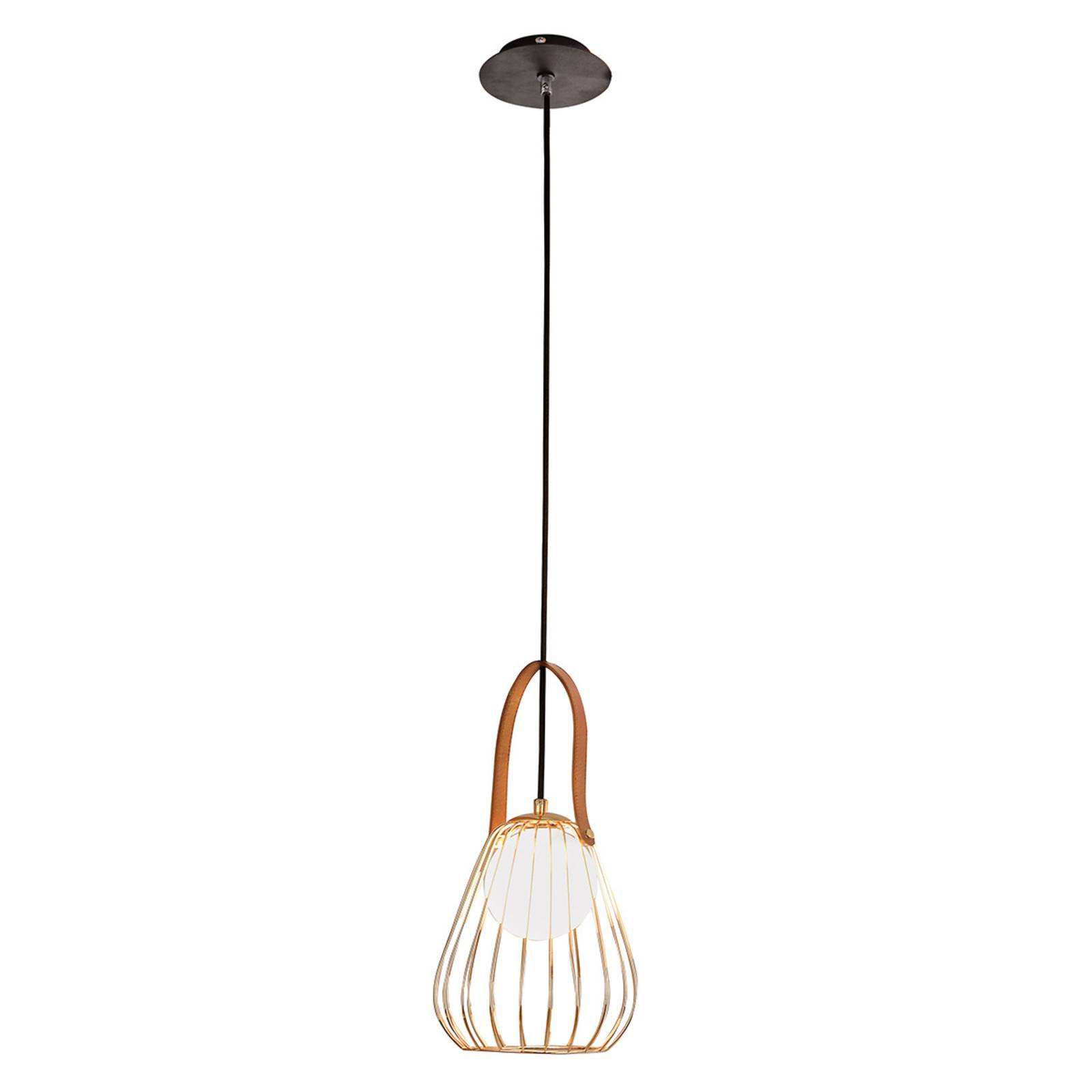 Con dettagli in pelle e gabbia aperta - Lampada a sospensione Levik La lampada a sospensione Levik è un moderno oggetto di illuminazione con numerosi dettagli, che possono essere meravigliosamente combinati con molti stili e colori interni. Combina vetro e metallo, oltre ai colori caldi e freddi, e si presenta molto armoniosamente coordinato. La luce di una lampadina G9 da inserire brilla dolcemente e senza abbagliamenti attraverso la sfera di vetro bianco opaco, che si trova all'interno della gabbia metallica aperta. La costruzione della gabbia ha una finitura oro lucido e contiene un cinturino in pelle marrone all'estremità superiore, che è attaccato come un manico. In contrasto con la calda tonalità dell'oro, il baldacchino del soffitto rotondo e la linea di alimentazione sono in nero. Levik non è solo una fonte di luce, ma ha anche un effetto decorativo nella stanza.