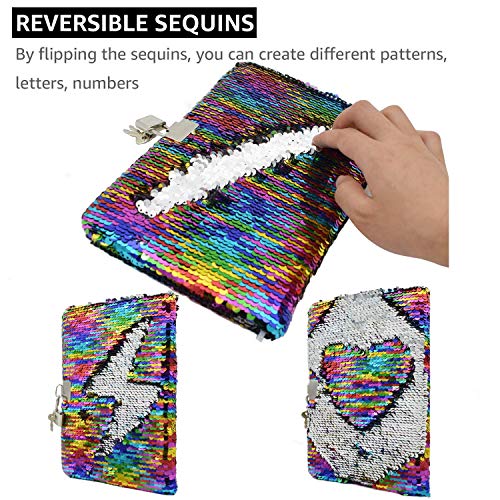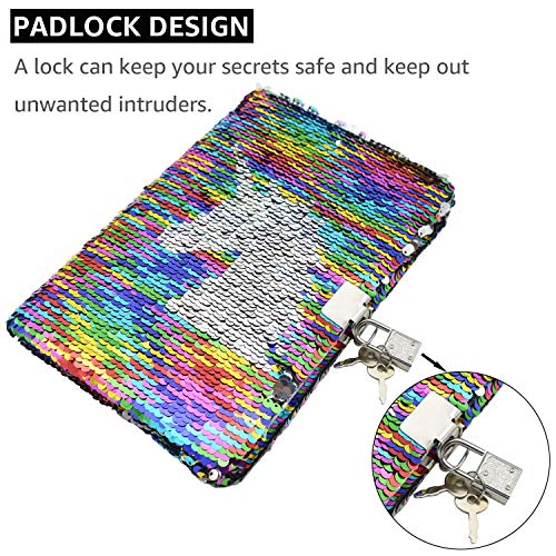 VIPbuy - Diario di viaggio reversibile con lustrini, con lucchetto e chiave, con angoli per foto, formato A5 (215 x 140 mm), 156 pagine, colore: da arcobaleno a argento (Unicorno)