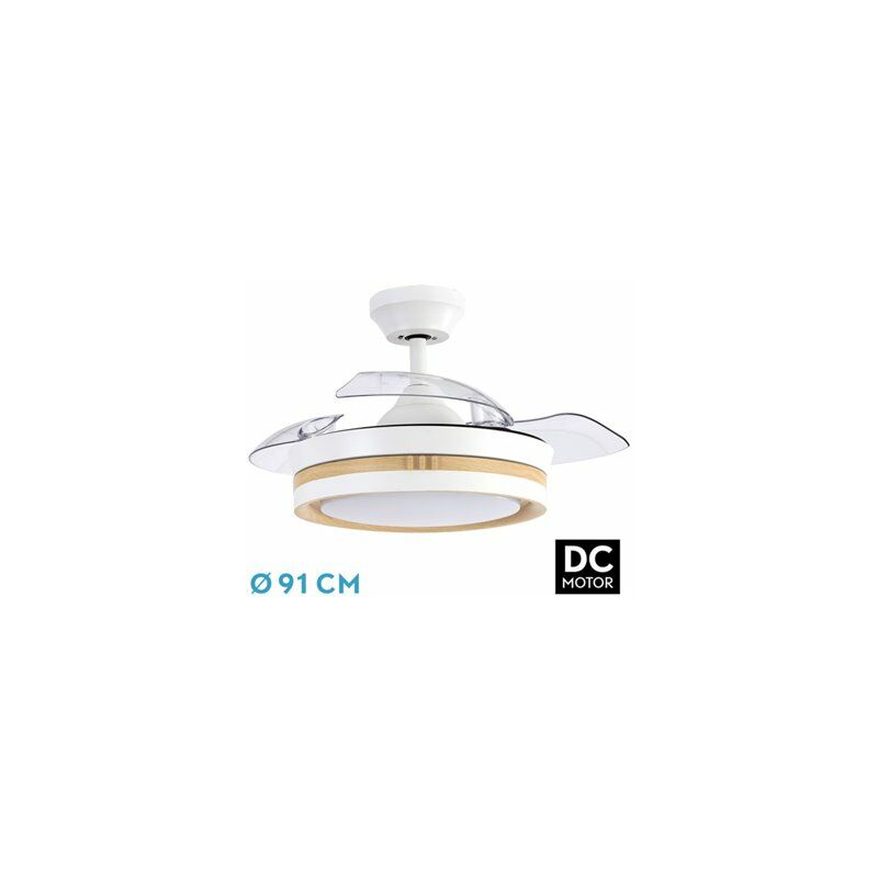 Viper DC Fan Bianco/Faggio 48W 3 Pale Il ventilatore DC della serie VIPER in colore BIANCO/BEECK è un pezzo moderno e originale che darà un tocco di eleganza alla tua casa.Ha tre lame DISEGNATIVE molto resistenti, realizzate in metallo, ABS e policarbonato.Il suo design presenta un anello nella sua struttura che si abbina a diversi materiali, rendendolo un importante pezzo di decorazione.Con sei velocità regolabili, motore DC di tecnologia LED integrata con una potenza di 48W e 4800 lumen, offre 3 TEMPERATURE LUCE SELEZIONABILI (3000-4500-6000K) che vi permetteranno di adattare l'illuminazione alle vostre esigenze: luce calda, luce naturale e bianco freddo. ha la regolazione dell'aria estiva o invernale.Le sue misure sono 34,5/47X41 centimetri con le pale ripiegate e 34,5/47X91 centimetri con le pale spiegate, con DUE MISURE DI PALO da installare a diverse altezze del soffitto.Include telecomando con MEMORIA COLORE e 1/TIMER 2/4/8 H. Questo modello è disponibile nei colori