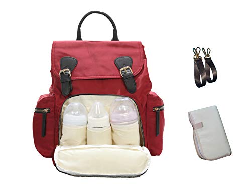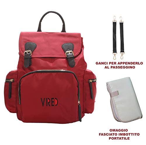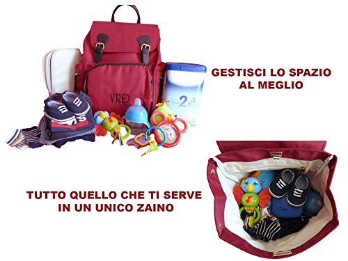 VIRED Zaino Mamma Multifunzione - Fasciatoio Bambino Impermeabile - Borsa Porta Pannolini Con Tasche Termiche - Bordeaux Oxford Rosso Elegante - x2 Ganci per Passeggino - x1 Fasciatoio Cambio Neonato