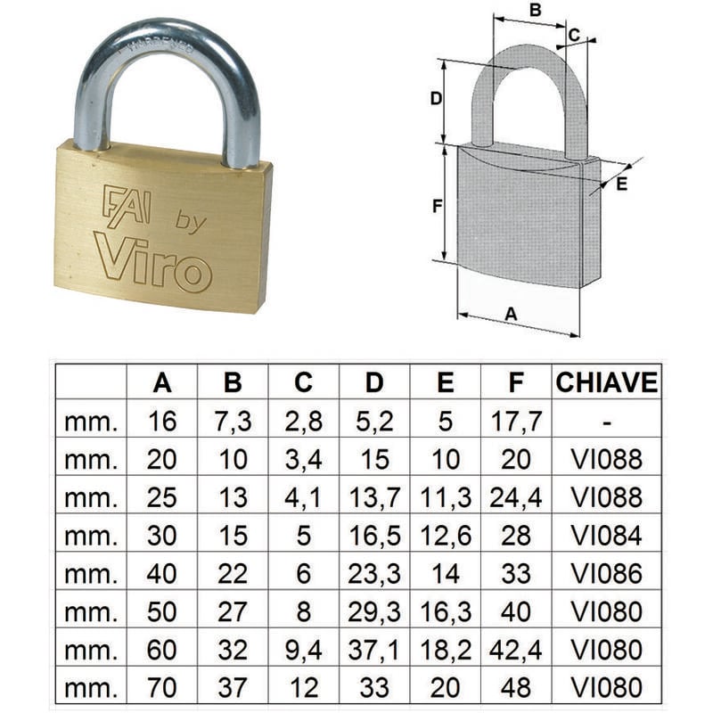 Corpo monoblocco in ottone massiccio satinato, arco in acciaio cementato temperato cromato, chiusura a scatto, dotazione 2 chiavi profilo VIRO