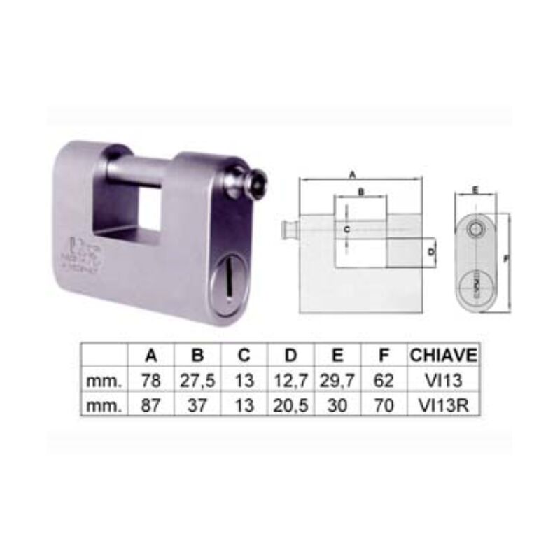 Mm.87 (art.4144) corpo monoblocco in acciaio speciale cementato e temprato - finitura nichelata chimica niploy process anticorrosione - barra di chiusura rotante in acciaio ø mm.13 cementato e temprato, alta resistenza al taglio, cilindro a 7 pistoni, sostituibile e ricifrabile protetto da piastrina rotante contro lo scasso ed il trapano - in dotazione 2 chiavi profilo viro top security in ottone nichelato - chiave estraibile solo a cilindro chiuso - contropistoncini in ottone a fungo contro l'azione del grimardello - scrocco in acciaio inox aisi 316 - molla pistoncini e scrocco in acciaio inox Categoria merceologica: Lucchetti e accessori - Sicurezza - Lucchetti rettangolari