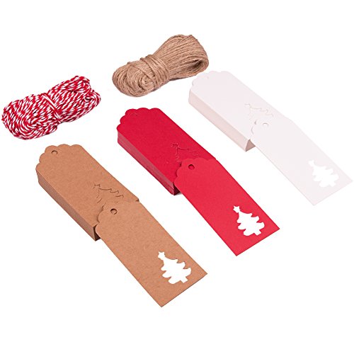 Vitasemcepli 100 Pezzi Bigliettini di Carta di kraft da Personalizzare con la Corda della Canapa Etichette Particolari per il Fai da te Segnaposti Matrimonio Natale Auguri Regali (Albero Natalizio)