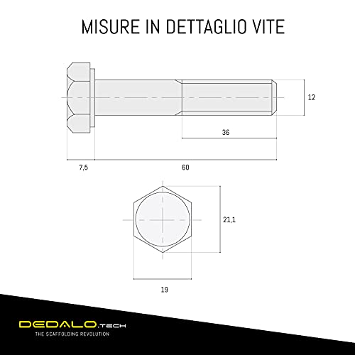Vite 60x12 mm Testa Esagonale con Gambo Parzialmente Filettato e Bullone per Giunzione di Travi/Tubi/Spinotti - Impalcature/Ponteggi - cod. SNSTE3012019 (20 pezzi)