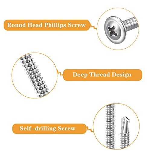 MATERIALE: realizzato in resistente acciaio inossidabile 410 per una perfetta protezione dalla corrosione, elevata durezza e stabilità. La perforazione, la maschiatura e il bloccaggio delle viti autoforanti sono completati contemporaneamente, una forte forza di legame. Queste viti inossidabili possono essere utilizzate all'interno e all'esterno