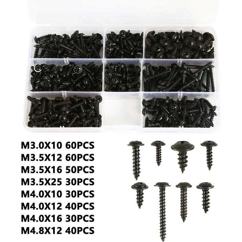 Tipo:: vite autofilettante. Stile della testa: testa svasata a croce a vite. Materiale per impieghi gravosi: questi dadi esagonali sono realizzati in acciaio al carbonio al nichel, fornisce resistenza e buona resistenza alla corrosione in molti ambienti. . Ampia applicazione: queste viti sono adatte per maniglie di porte, industria dei macchinari e altre piccole riparazioni in officina, garage o fissaggi di mobili per la casa, ecc. . Confezione: 340 pezzi e una scatola.60 pezzi M3.0x10,60 pezzi M3.5x12,50 pezzi M3.5x16,30 pezzi M3.5x25,30 pezzi M4.0x10,40 pezzi M4.0x12,30 pezzi M4 .0x10, 40 PZ M4.8x12 . Servizio post vendita::Il nostro prodotto ha 2 anni di garanzia di qualità, se il tuo prodotto ha qualche problema, ti preghiamo di inviare un'e-mail al venditore alla prima preoccupazione. Risolveremo il problema entro 24 ore. .
