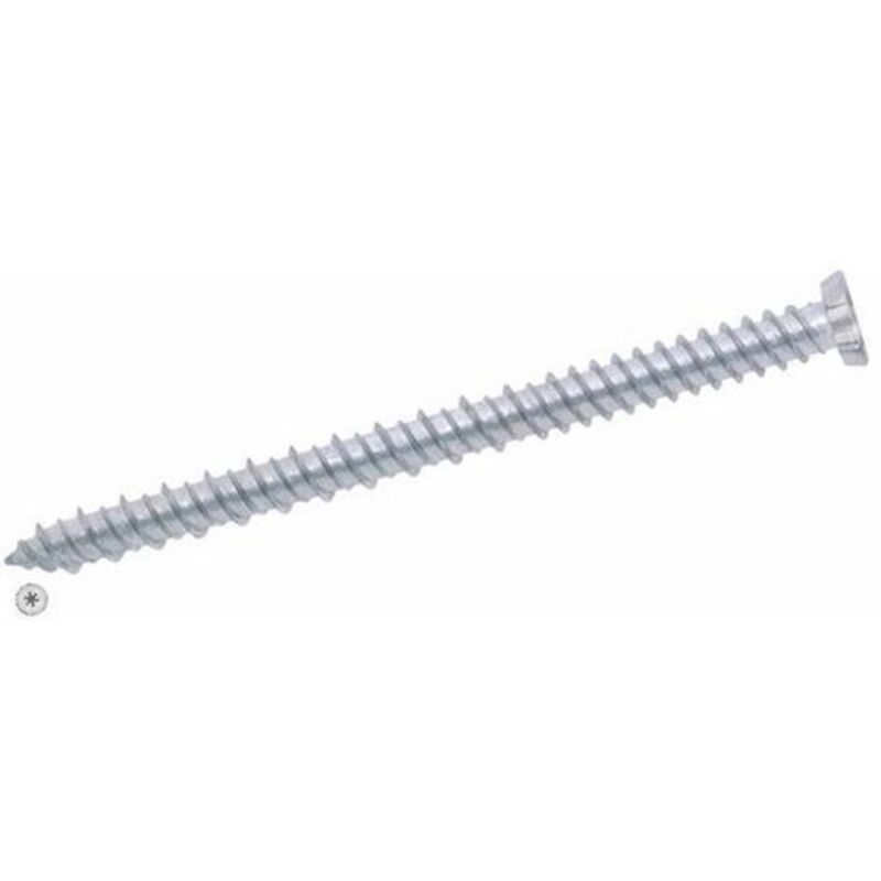 Vite testa piana svasata zincata bianca con impronta torx T-30 - Utilizzo senza tassello - Specifica per fissaggi su calcestruzzo (norme EN 14592/2009) Confezione: 100 pz Misura 7,5x120 mm.