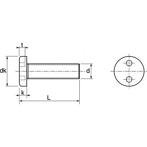 Dimensioni: D (mm) = M 5, D x L x D x K x T (mm) = 5 X 20 X 10 X 3,2 X 1,8, forma della testa: testa cilindrica, azionamento: 2 fori