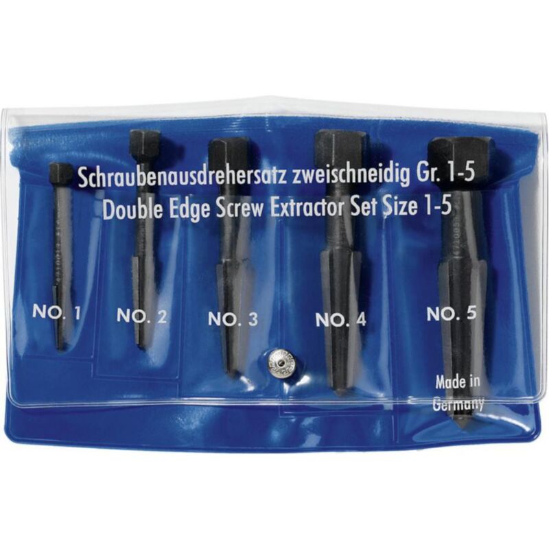 Rennsteig Outlet a vite Imposta 2 taglio, 5 parti, dimensioni da M 5 a M 20 per i danni senza danno da viti o bulloni rotti. Per i fili di destra e i fili a sinistra hanno utilizzato interferenze a doppio taglio risolvibili nella superficie della vite danneggiata. Versione brevettata in superficie di taglio bilanciata con punta di grano e base a sei-banale per fili destra e sinistra utilizzabili in tasca in plastica