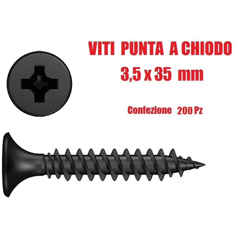 VITI CON PUNTA A CHIODO - Ø 3,5 x 35 mm - Confezione da 1000 Pezzi DESCRIZIONE PRODOTTO Le viti con punta a chiodo sono utilizzate per il fissaggio del cartongesso su lamiere o profili metallici. La confezione è formata da 1000 viti. DIMENSIONI VITI -Lunghezza 35 mm, -Diametro 3,5 mm IMPIEGO Utilizzabili per la formazione di pareti, contropareti e controsoffitti.