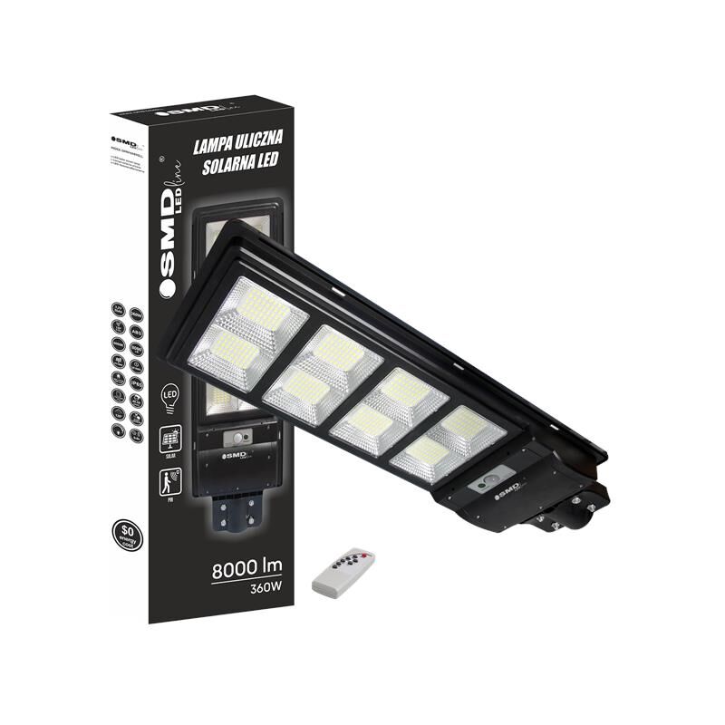 Dati tecnici: Potenza: 360WColore luce: 6000KFlusso luminoso: 8000 lm Angolo fascio: 120°Sorgente luminosa: 360 x 5730 SMD LEDBatteria: 3,2V 20AhPannello solare: 6V - 20WDimensioni: 730 x 250 x 60 [mm]Diametro foro: 48- 50 [mm] Classe di resistenza: IP65 Colore: Nero Tempo di funzionamento: - circa 12 ore (uso normale) - circa 6 ore (illuminazione continua 100% luminosità) - circa 20 ore (illuminazione in modalità standby [20% luminosità]) Tempo di ricarica: 6-8 ore in piena luce solare. Tipo di sensore di movimento: PIR. Sensore crepuscolare: sì. Controllo del programma: tramite telecomando IR. Angolo operativo del sensore: 120°. Distanza di rilevamento: 6-12 m ~ + 65 ° C Durata della vita: 30.000 ore Materiale della custodia: ABSU La lampada solare LED di SMD LEDline con una potenza di 360 W è una soluzione moderna perfetta per l'illuminazione di strade, giardini, proprietà, cancelli carrabili, piazze e parcheggi. Grazie all'utilizzo dell'energia solare i costi di gestione sono