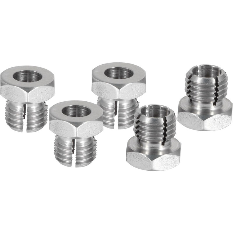 Vite di serraggio interna in acciaio inossidabile (1.4301/1.4305). * Soluzione innovativa per il fissaggio semplice e rapido di componenti cilindrici, come ad esempio comparatori, cilindretti o profili tubolari. * Tali componenti possono infatti essere serrati e allentati semplicemente serrando o allentando la vite per interni. * Il foro cilindrico nella vite di serraggio interna permette la regolazione in continuo della sporgenza del componente serrato. Funzione: La vite di serraggio interna può essere avvitata in qualsiasi dispositivo mediante una filettatura metrica semplice, finché la testa della vite di serraggio interna non si trova sulla superficie piana del dispositivo. Serrando ancora un po' la vite, la filettatura della vite di serraggio interna e quella del dispositivo si avvicinano. La speciale struttura della vite di serraggio interna fa sì che la dilatazione della vite sia ridotta e interamente reversibile. La leggera dilatazione è sufficiente a ridurre il diametro
