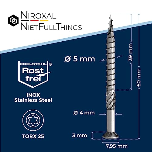 250 viti per terrazze, lunghezza 5 x 60 mm, perfette per assi da 25 mm, in acciaio inox C1 temprato, Torx 25 con 1 bit, viti per legno con testa piatta, filettatura parziale