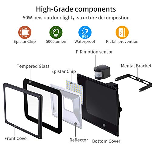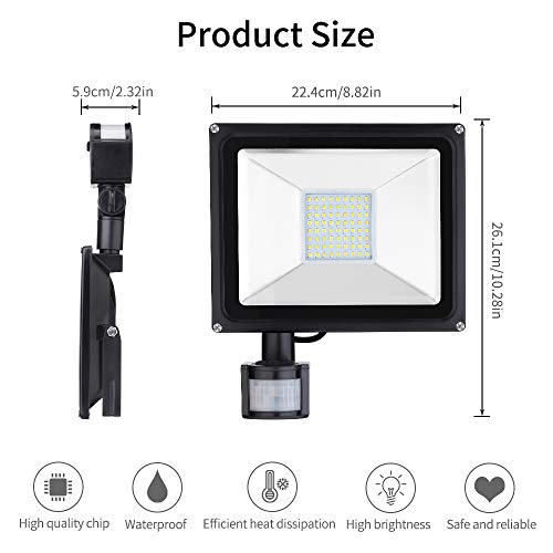 【IP65 Impermeabile】L'impermeabilità del proiettore a LED con sensore di movimento è IP65, adatto per uso esterno.il che garantisce che la faro a LED possa resistere a pioggia, nevischio o neve. Luce di Sicurezza posizionalo ovunque, compresi Hall, Giardino, Patio, Terrazza, Cortile, Recinto, Vialetto, Pareti Esterne, Piazze e Moli, Basket, Campi da Calcio, Garage, Hotel, ecc.