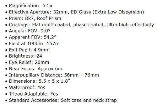 Ingrandimento: 6.5 x efficace apertura: 32 mm, in vetro ed (extra Low Dispersion)