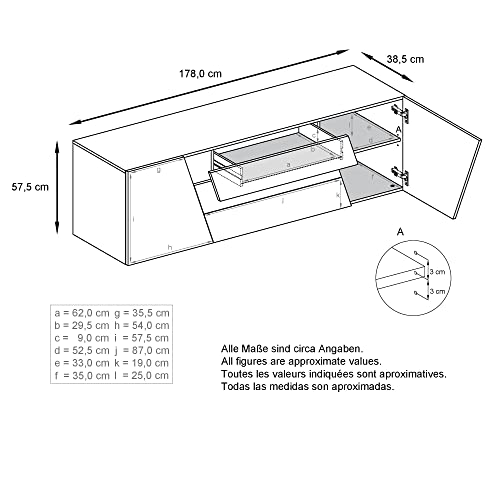 La fornitura comprende la cassettiera, l'illuminazione a LED, le istruzioni dettagliate e illustrate e il materiale di montaggio necessario. Dimensioni approssimative dell'armadio a pavimento in cm (LxAxP): 178 x 69,5 x 38,5
