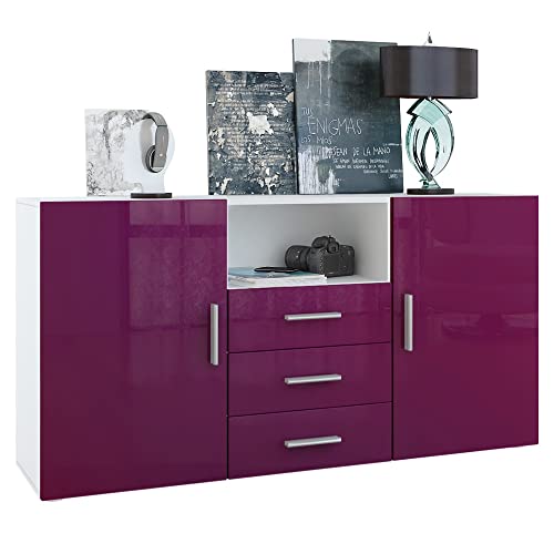 Vladon Credenza Skadu, mobile con 2 ante, 3 cassetti e 1 scomparto a giorno, bianco opaco/violetto porpora lucido (138,5 x 71,5 x 35 cm)