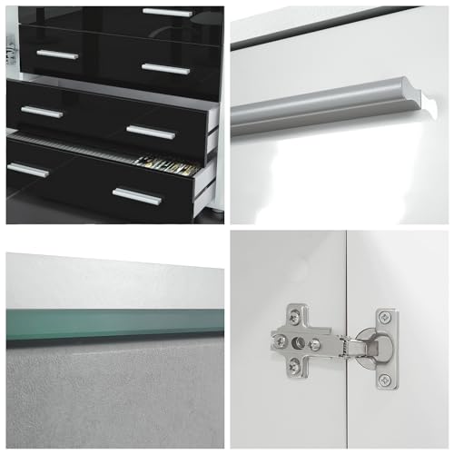 Apertura: Il mobile moderno con cassetti e ante è dotato di discrete maniglie argentate. I cassetti del mobile scorrono quasi silenziosamente su guide metalliche telescopiche, rendendoli molto maneggevoli.