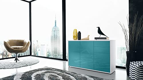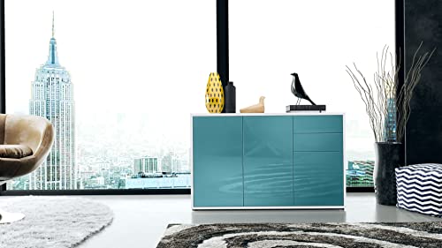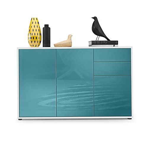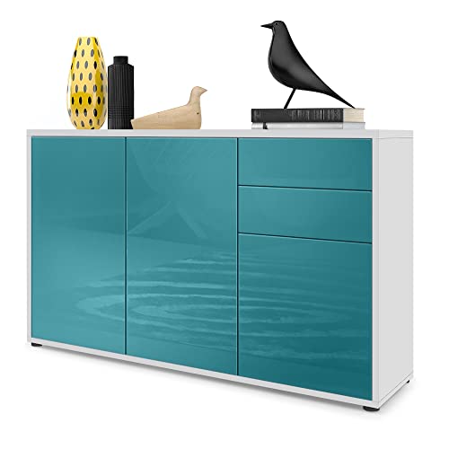 Vladon Madia Ben V3, Mobile a 3 ante e 2 cassetti, Bianco opaco/Teal High Gloss (117 x 74 x 36 cm)
