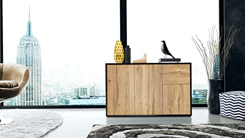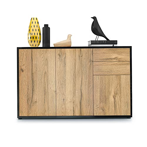 Vladon Madia Ben V3, mobile con 3 ante e 2 cassetti, nero lucido/rovere naturale (117 x 74 x 36 cm)