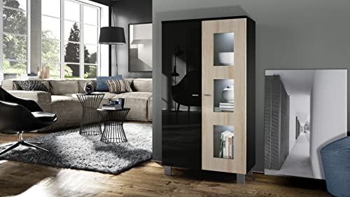 Vladon Vetrina Denjo, vetrina indipendente con 2 ante e 3 pannelli in vetro, nero opaco/nero lucido/rovere grezzo, illuminazione a LED inclusa.