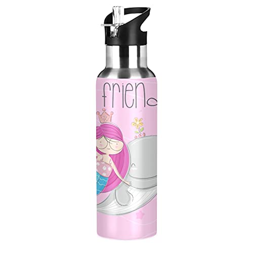 Vnurnrn Simpatica Sirenetta Delfino Bottiglia Acqua Acciaio Inox, Isolato Borraccia Termica Senza BPA 600ML per Bevande Calde e Fredde per Bambini Sport Ciclismo Scuola