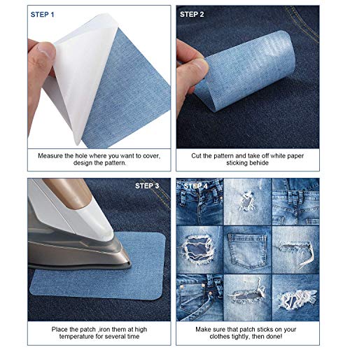 Facili da usare, lavabili: Facili da usare, basta tagliare la toppa in denim della forma che desiderate, riscaldare l'area dei vestiti su cui volete applicarla, posizionare la toppa (lato lucido verso il basso) e premere con il ferro da stiro. Posizionare la toppa dove serve, poi stirare e il gioco è fatto;