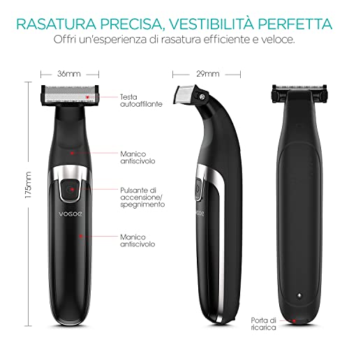 PRECISO & EFFICACE - Questo rifinitore barba elettrico VOGOE è equipaggiato con tecnologia di rasatura ingegneristica di precisione, che muove la lama a una velocità di 100x al secondo, per tagliare i peli con una precisione di 0.08 mm. Le lame si affilano da sole, per una precisione a Lunga Durata e durevolezza, che rifiniscono e rasano qualsiasi lunghezza del pelo di barba, testa e corpo.