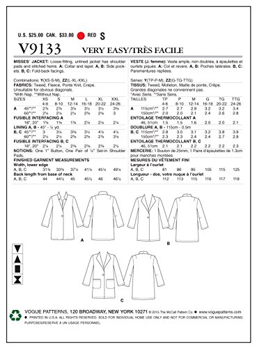 Vogue Patterns Vogue Pattern,9133 Y Giacca da Donna, Taglie XSm(4-6)-Sml(8-10)-Med (12-14), Size Y (X-Small-Small-Medium) US