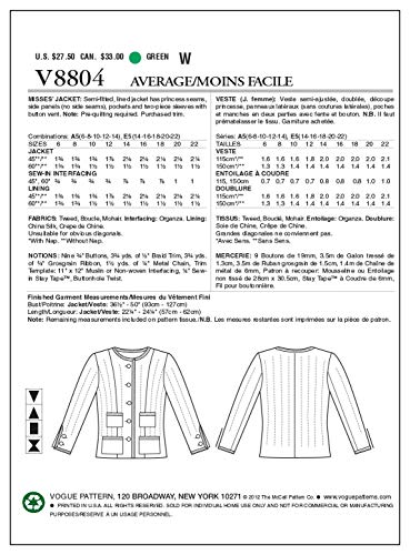 VOGUE PATTERNS Misses' Jacket - A5 (6-8 - 10-12 - 14) Pattern