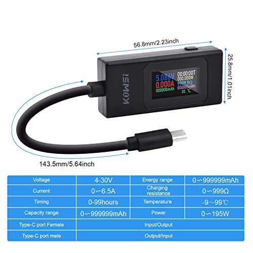 VOKTTA Tester USB C Tester per caricabatterie USB Type-C,Multimetro Voltmetro Amperometro 0-6.5A 4-30V Display Potenza Corrente Tensione Temperatura