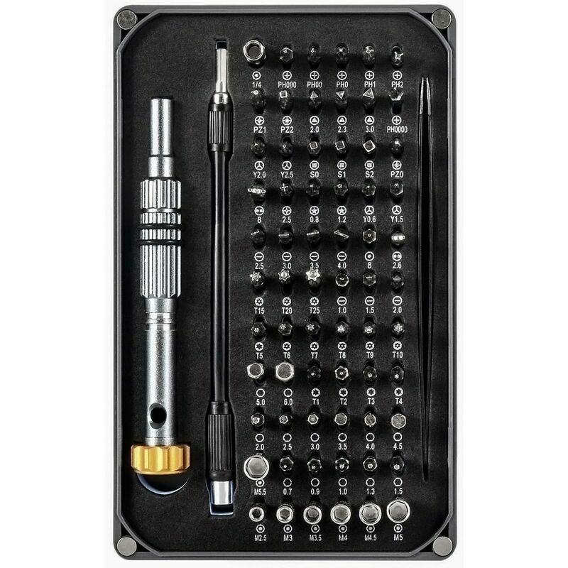 strumento di riparazione ideale per smartphone, tv, ventilatore elettrico, laptop e altro ancora. Realizzato in acciaio al cromo vanadio, elevata durezza. L'impugnatura in lega di alluminio offre una presa comoda. La base girevole a 360 gradi consente di ruotare l'impugnatura mantenendo una pressione costante. Il cacciavite ha una punta magnetica. L'asta di prolunga morbida consente di raggiungere facilmente i punti difficili da raggiungere e le pinzette facilitano la presa di piccoli accessori. La custodia magnetica in plastica per il trasporto mantiene tutto organizzato e facile da trovare. Facile da trasportare. Dimensioni: 17*10,5*3,5 cm